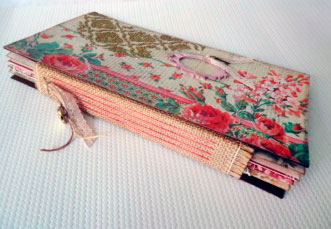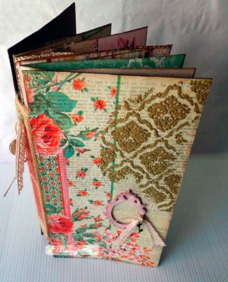 Realizaremos un álbum Shabby o Romántico, con diferentes técnicas de iniciación al mixed-media, trabajaremos con gesso, tintas de pad, plantillas, sellos. Realizaremos collage y decoupage con servilleta para acabar con una encuadernacion de medio lomo con cosido doble visto.