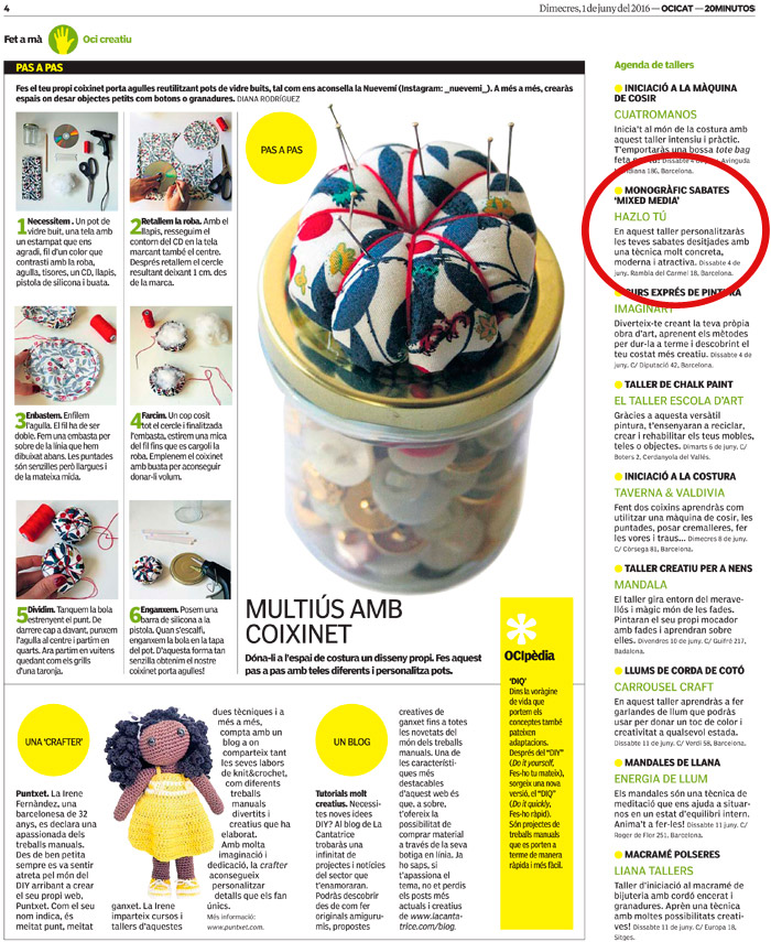 El pasado miércoles día 1 de junio salió una reseña nuestra en el periódico 20 minutos Cataluña, dentro de su sección Oci.Cat; «Fet a mà – Oci Creatiu».